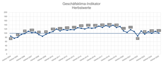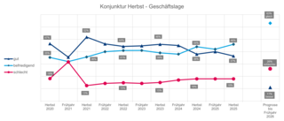 Der Geschäftsklimaindex, der Lage und Prognose zusammenfasst, liegt mit 100,7 Punkten praktisch auf Vorjahresniveau (Herbst 2024: 100,4).
