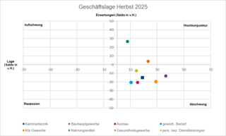 Wenngleich alle Gewerbegruppen von gesunkener Nachfrage berichten, verzeichnen sie doch alle eine insgesamt positive Herbst-Geschäftslage – die erwartete Entwicklung unterscheidet sich jedoch deutlich. Zwei Branchen (Gesundheit und Nahrungsmittel) erleben Hochkonjunktur, die anderen bleiben im Abschwung.