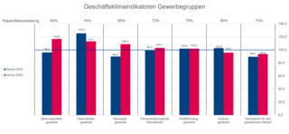 Die Handwerke für den gewerblichen Bedarf bleiben Schlusslicht. Der Index liegt bei 93,8 Punkten (plus 4,3), die Auslastung bei 75,1 Prozent (minus 2,1). Die Nachfrage von Unternehmen nach Zulieferprodukten und -leistungen bleibt verhalten und dürfte weiter sinken.